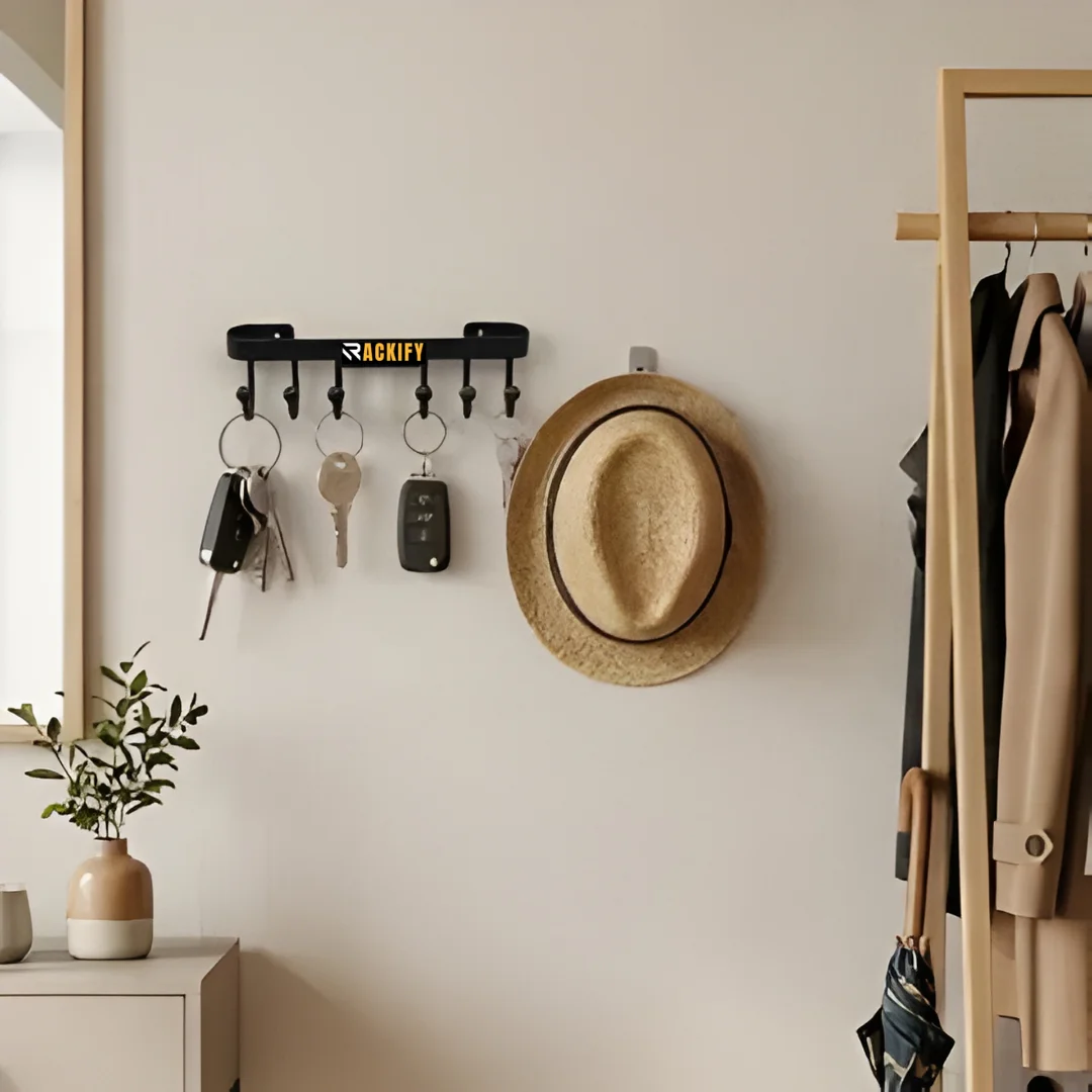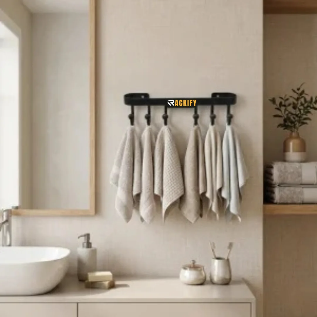 Hang keys, coats, towels, and utensils effortlessly with this 6-hook wall mounted rail. Sturdy black metal construction supports multiple items in entryway, kitchen, or bathroom. Space-saving horizontal design keeps everything organized and within reach. Heavy-duty hooks and easy wall fix make it a reliable daily organizer. Perfect wall hook rack, multi-hook rail, and entryway storage solution—strong, stylish, and built to handle real-life use.